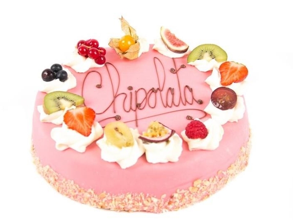 Chocolade kapsel gevuld met een laag frambozenbessenmoes en chocolade creme en een laag met Zwitserse room (gele room en slagroom) met gehakte hazelnoten en rum. Geglaceerd met chocolade ganache,